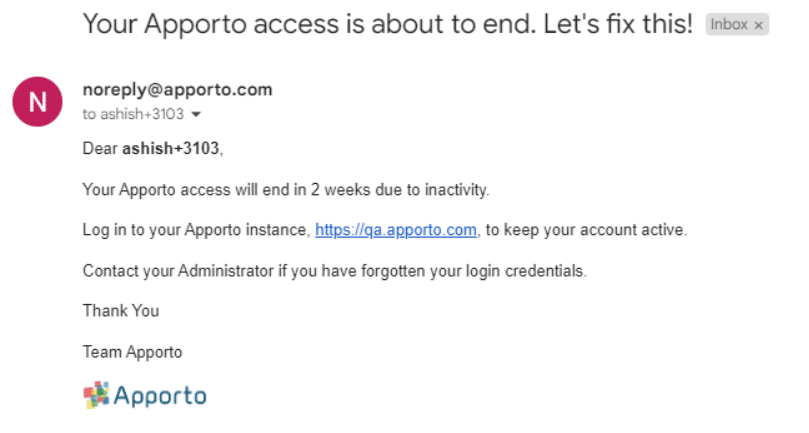 The primary goal of these emails is to notify users when they are about to lose access to Apporto – and to warn them in case they may need to access files prior to account deletion (30 days after deprovisioning, by default). |