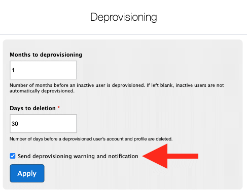 Emails to warn users when they are about to be deprovisioned (due to inactivity) and notify them when they have been deprovisioned (by the system, administrator, or inactivity, depending on your settings).