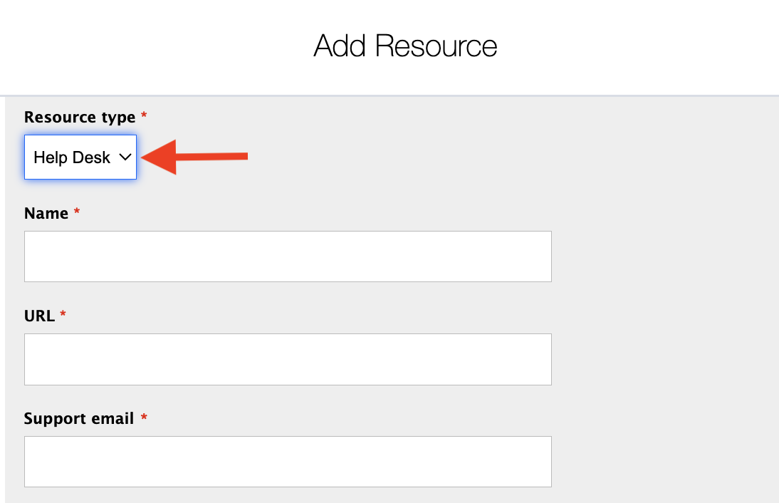 In the Admin Portal, navigate to Setup, and select Help Menu. Click New to add a new resource. Select “Help Desk” from the dropdown menu. Enter a name (which will appear under the Help menu), URL, and email address.
