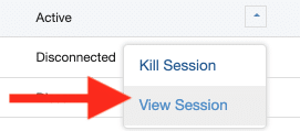 Admin ability to view an an active user session – if the user grants permission. From the Sessions screen, locate an Active session and select “View Session” from the dropdown menu.