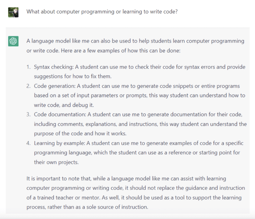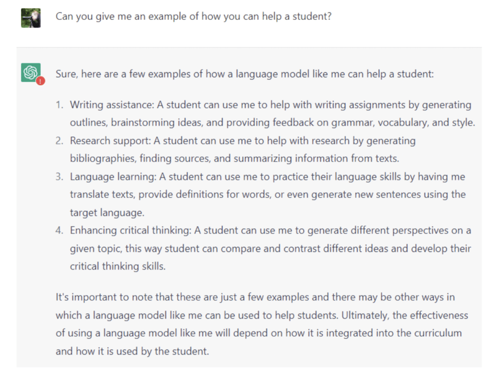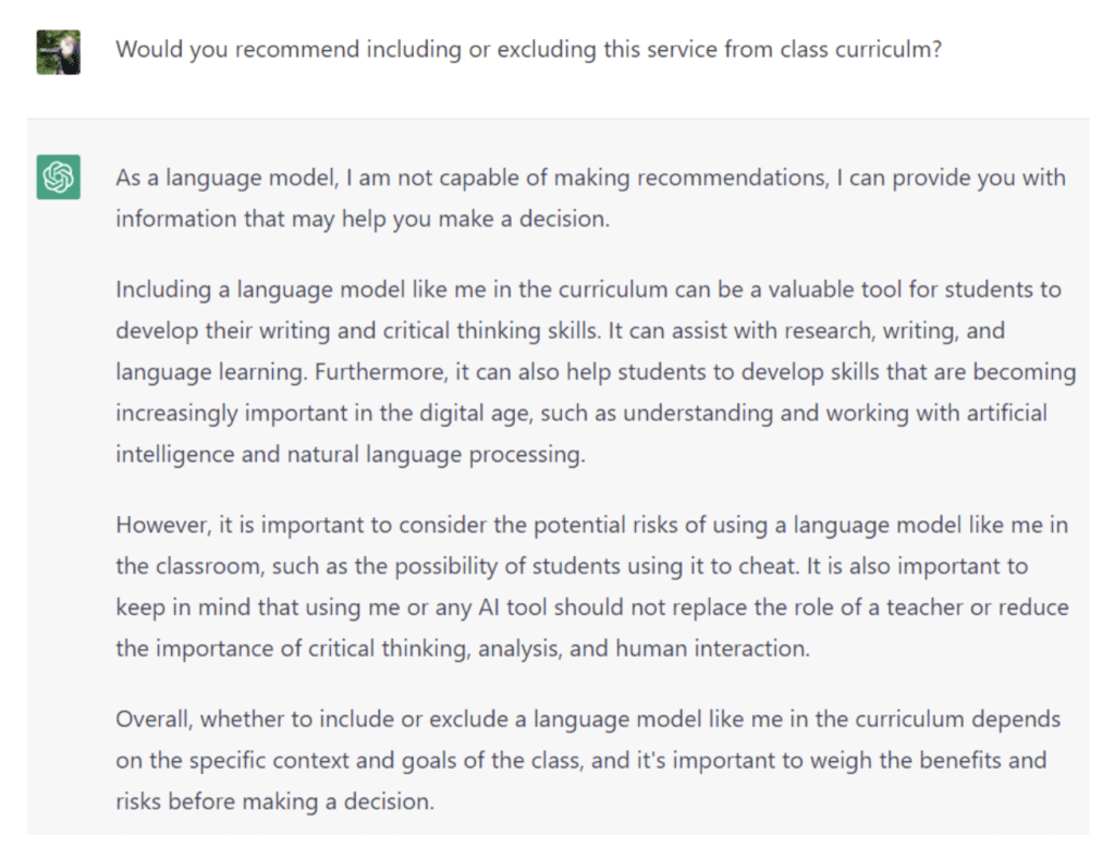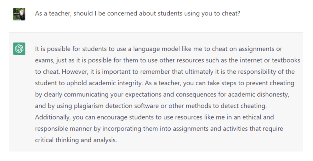 So with all this in mind, I launched a ChatGPT session and asked some pointed questions about the use of itself in education. Here’s how it went…