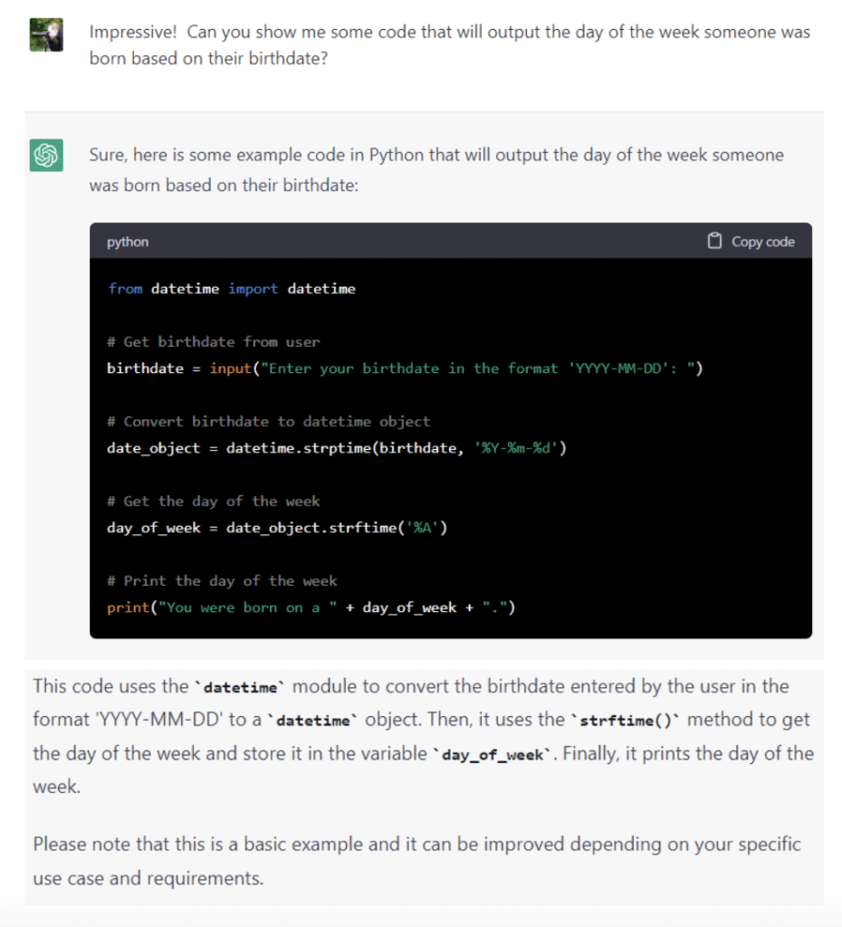 A nice end to my first interaction with ChatGPT and overall, I love the power and promise it holds. Of course there will be challenges going forward, but I’m excited to see how different use-cases evolve and how the depth of knowledge continues to grow around this exciting technology.