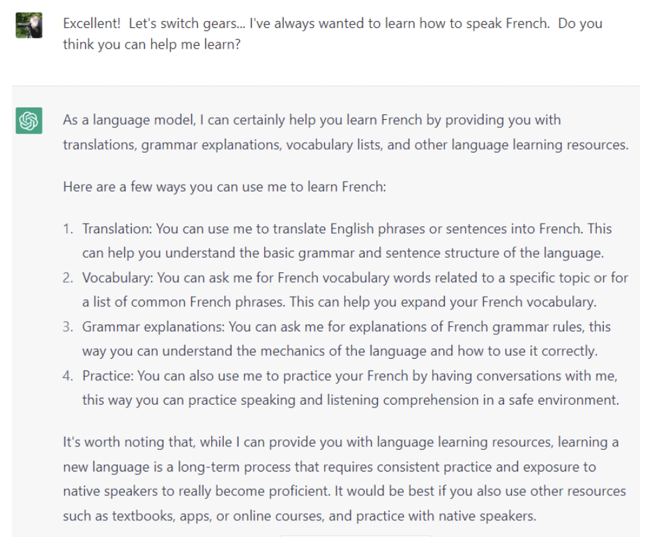 For my final topic, I went in a different direction: foreign language studies. Here’s what ChatGPT provided…