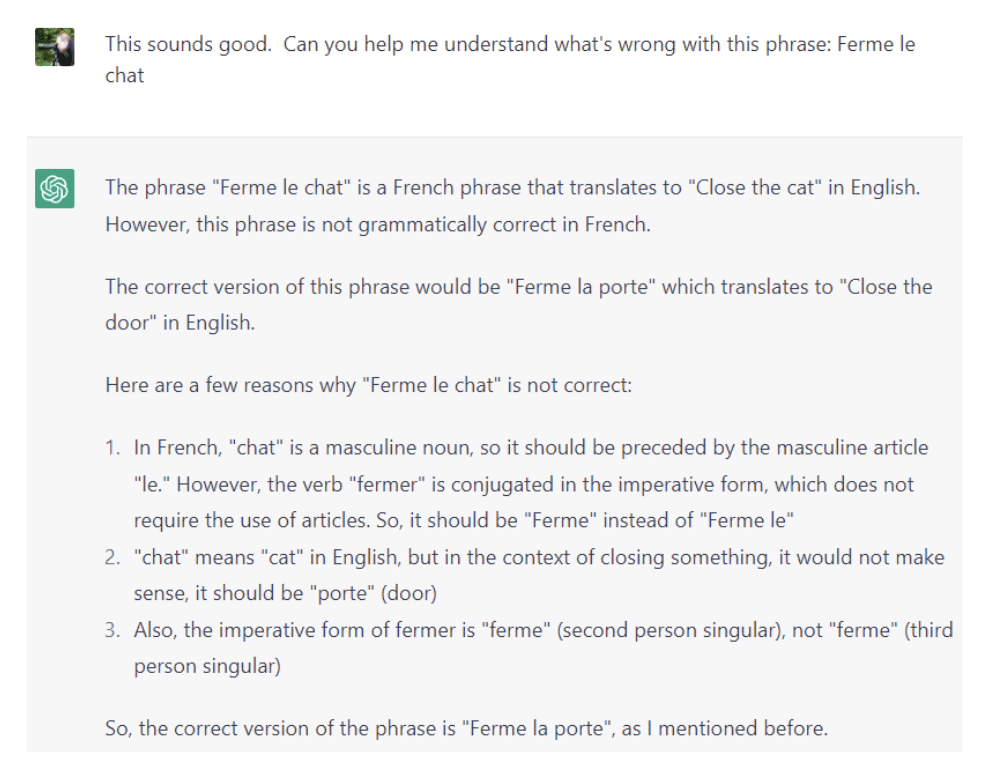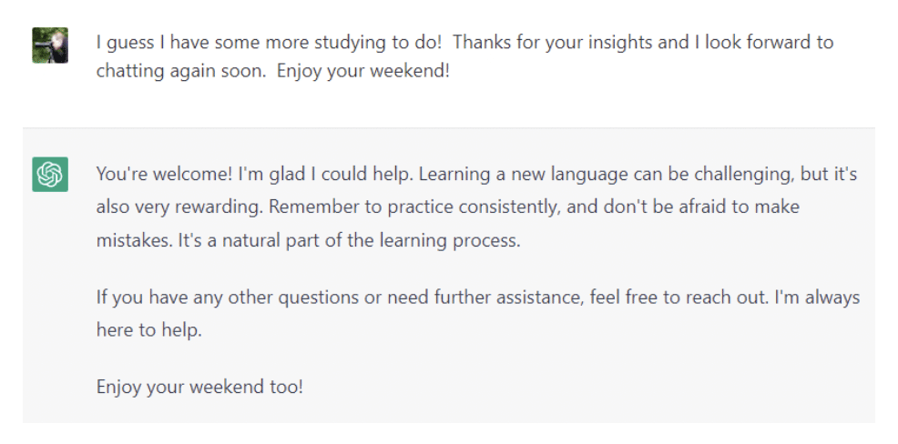 I did know that the phrase was wrong, but had no idea in how many ways! One of the fun things about the ChatGPT model is how conversational it is. Here’s how I closed out my session…