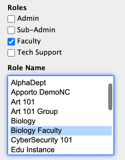 If the Sub-Admin, Faculty, or Tech Support box is checked, the ‘Role Name’ box displays and you will be prompted to select from available custom roles. (Role Names are defined in the Roles screen and grant permissions to particular groups, apps/desktops, and features.)