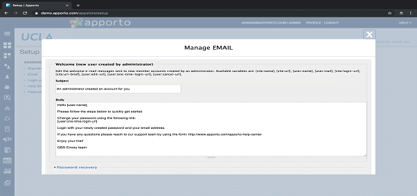 You may change the content of the Welcome Email ‘Subject’ and ‘Body’ by editing the text or variables in the boxes.