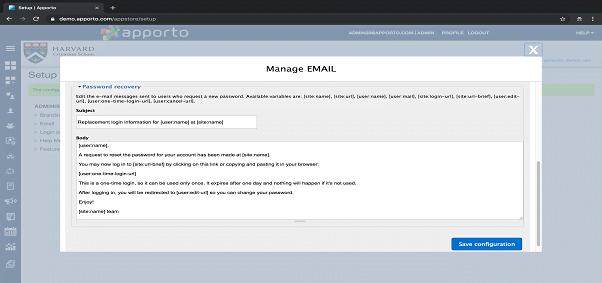 When you’ve finished editing the email templates, click Save configuration to save your changes.