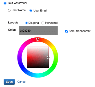 The watermark may be an image or text. If text is selected, you may choose between the user’s full name or email. Additional configurations are available for the font size, color, orientation, and transparency.