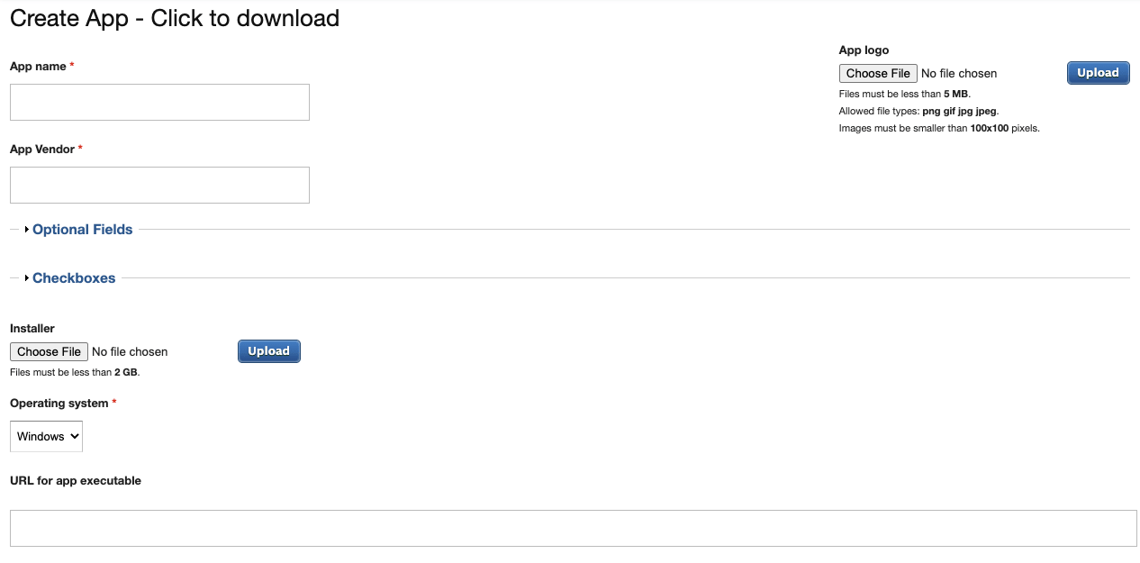 If you did not upload an installer, enter the URL from which the app can be downloaded in the URL for app executable text box.