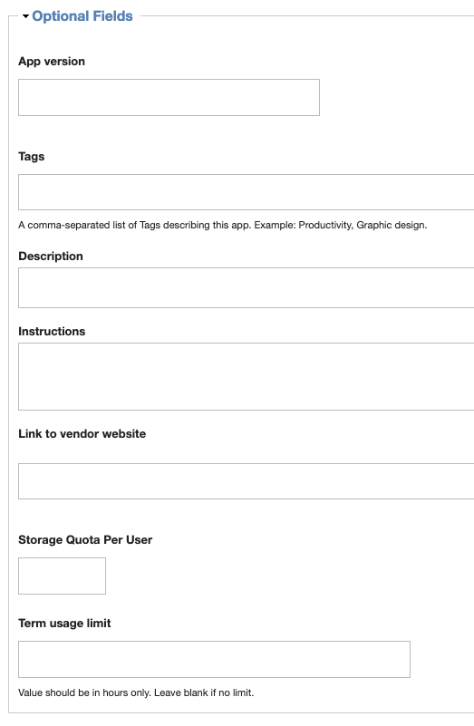 If desired, enter a brief Description of the app, any special Instructions, and/or a Link to vendor website.