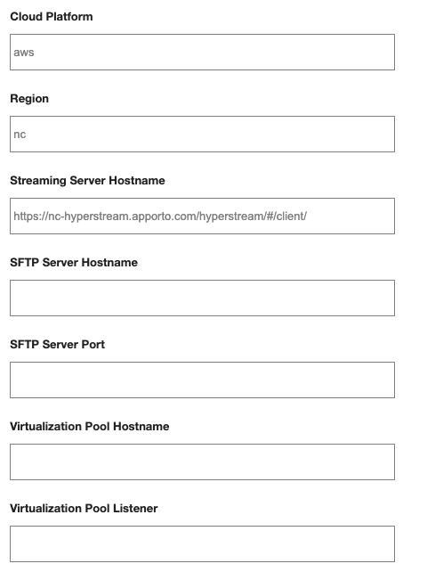 Enter key information to tell the system where the application is installed and which streaming and SFTP servers to connect to.