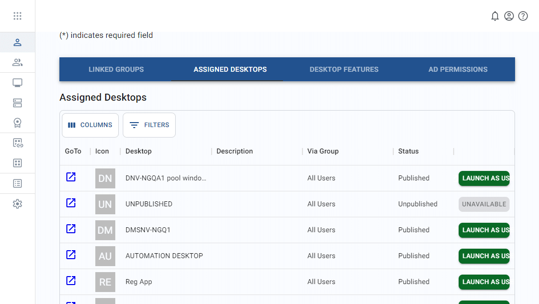 icon for a desktop application to view its details. - Click on the launch as user button for a desktop application to impersonate the user. See the article on impersonation for more information.