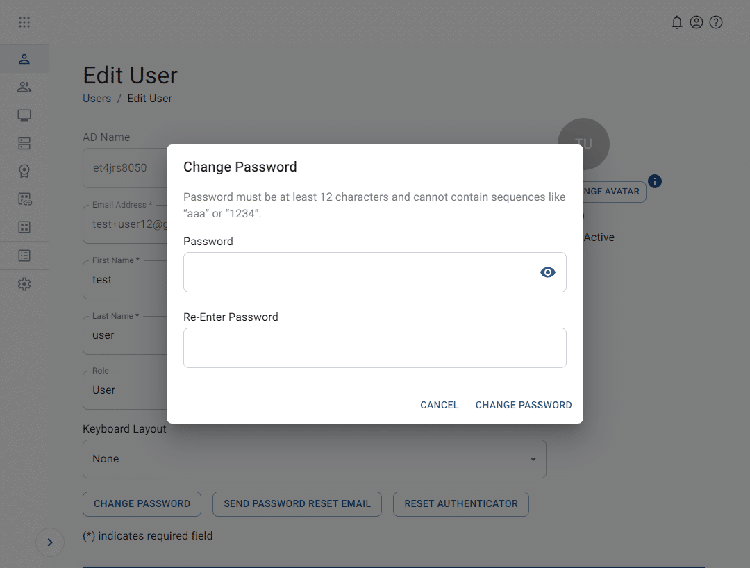 - Change password – This triggers a pop-up for setting a new password.