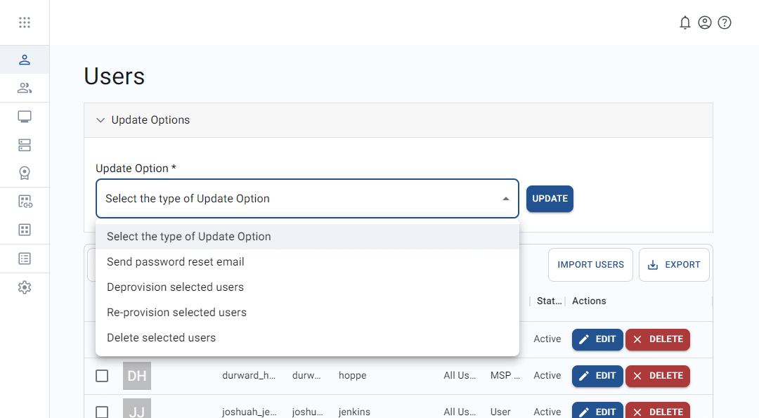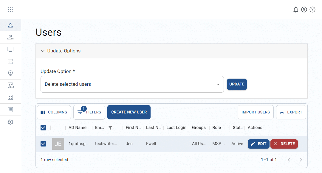 From the Users page, you may apply update functions to one or more users in the list.