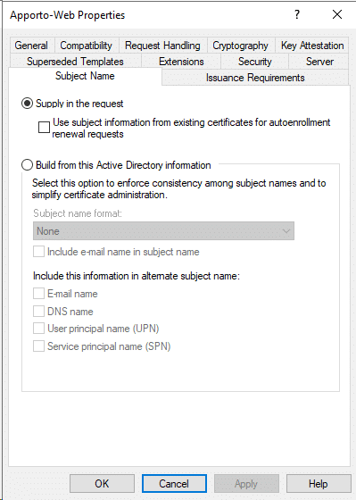 - Leave defaults until Request Certificates. Select Apporto-Web template and click Details-Properties.