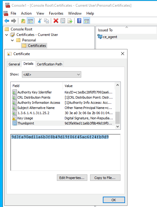 - Open this certificate, go to the Details tab, and copy the Thumbprint field value.