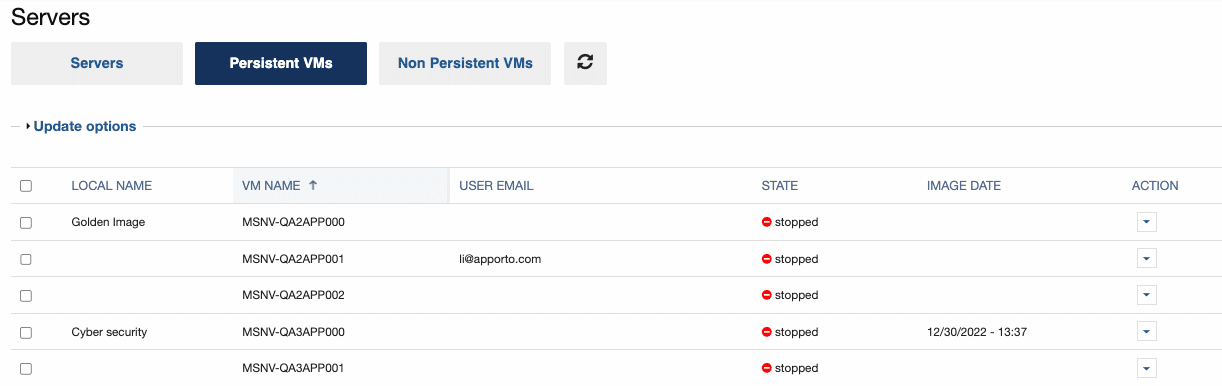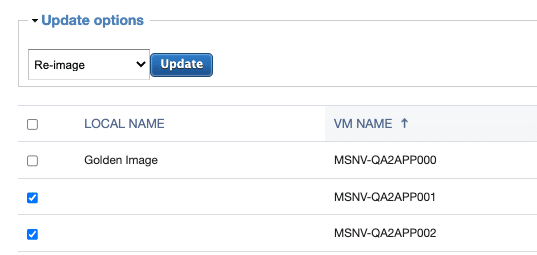In this case, simply select the boxes for the relevant VMs (or check the top box to select all VMs) and click Update Options.