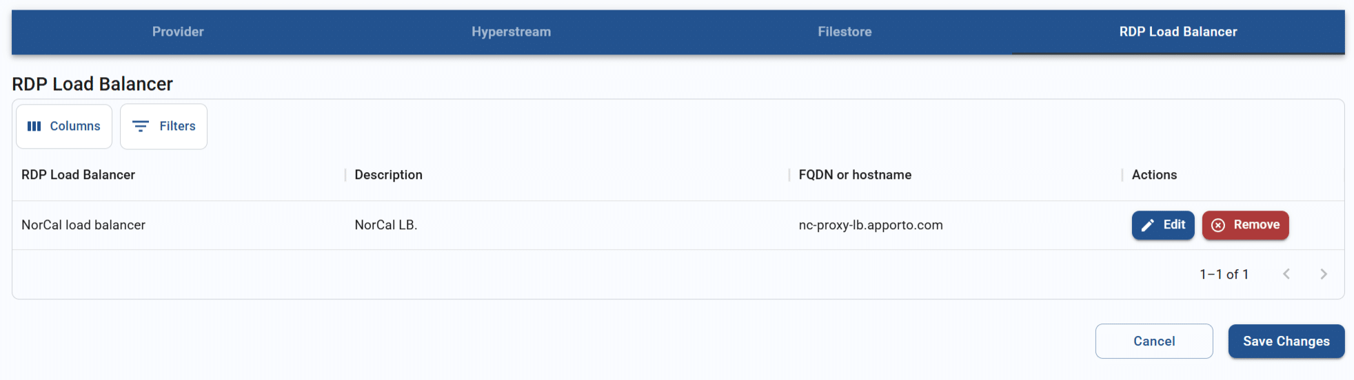 - From the “RDP load balancer” section, click edit on the existing load balancer record.