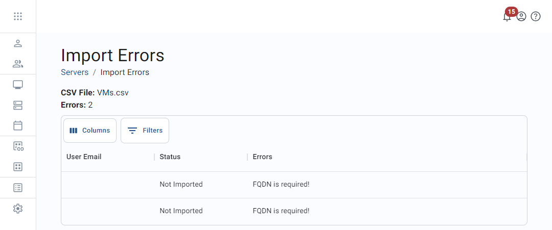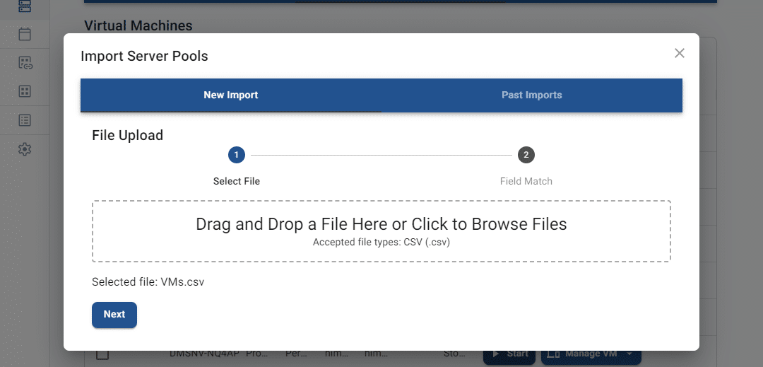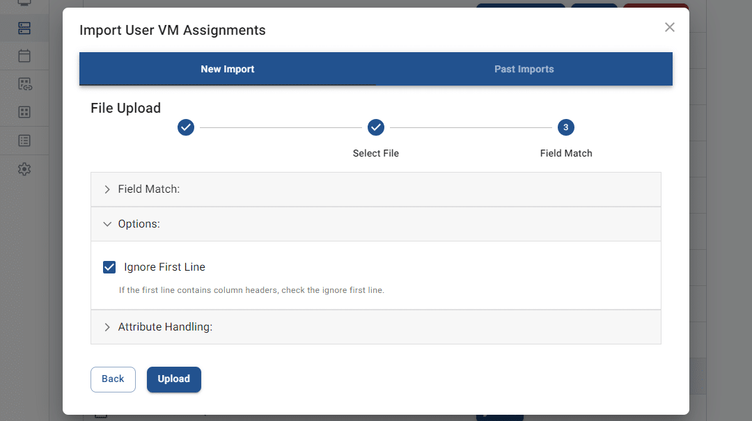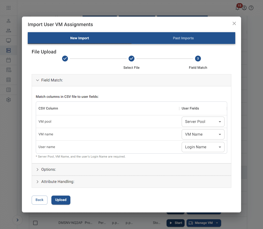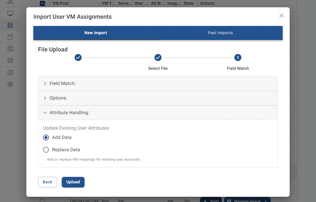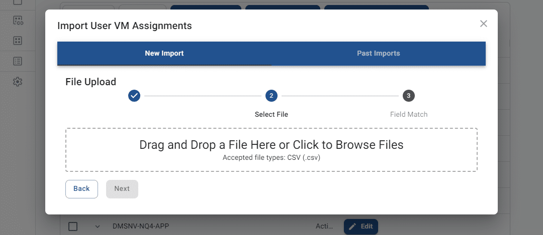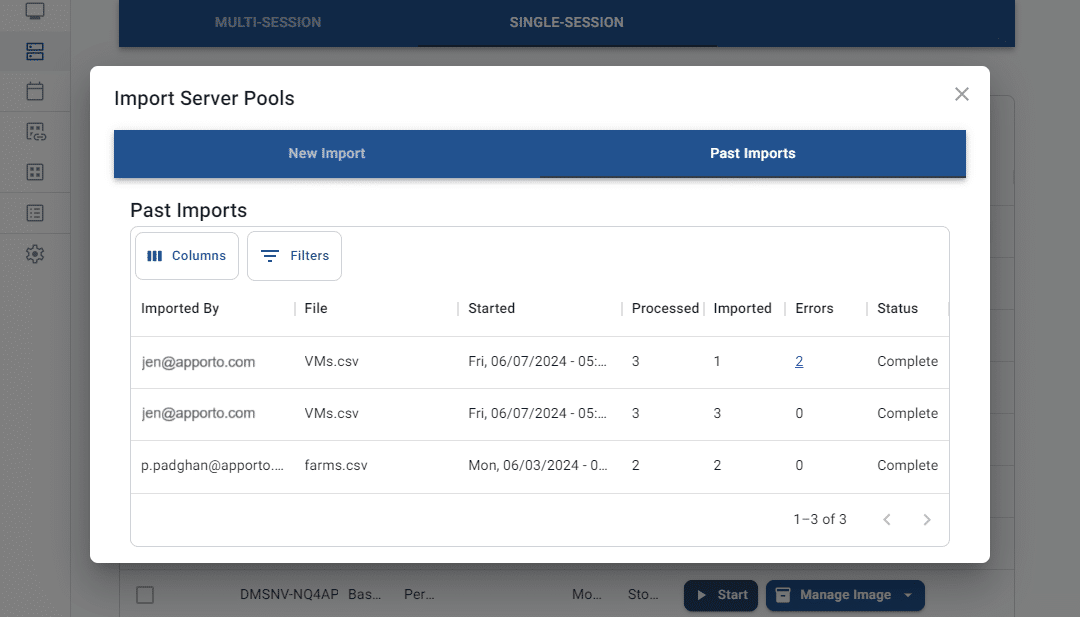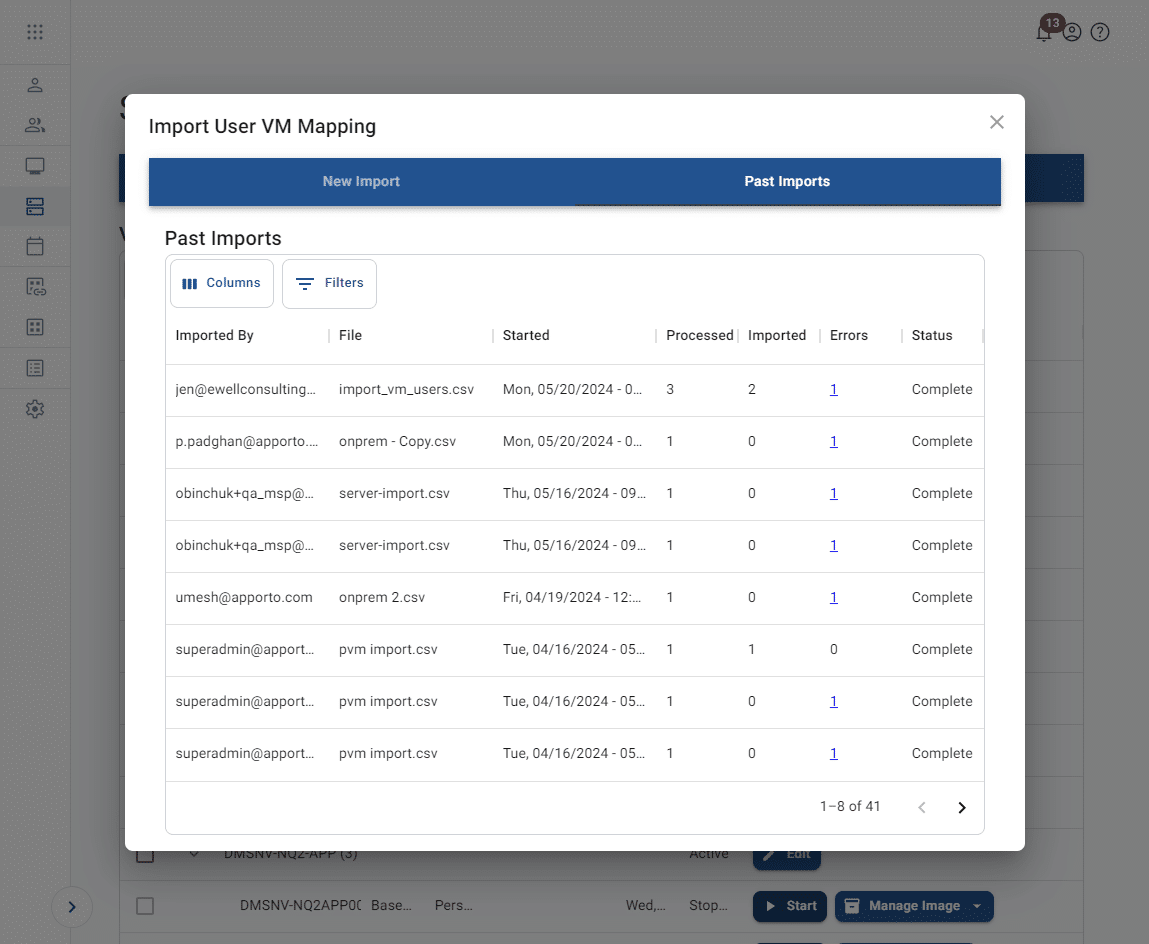 - To view completed imports, click import user VM assignments again and select the “past imports” tab of the Import user VM mapping pop-up screen. To make it easier to locate specific imports, you may adjust the visible columns or filter or search through the list. See the article on working with lists for more information.