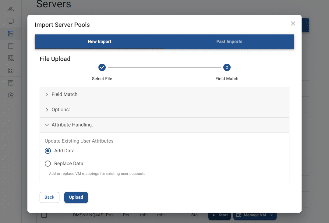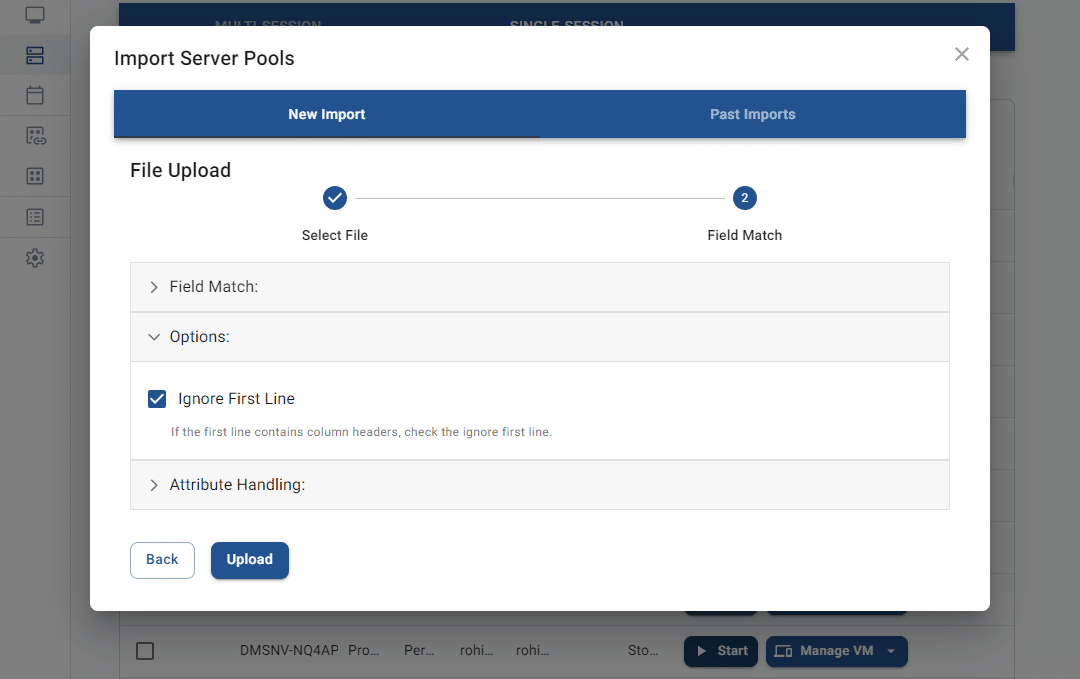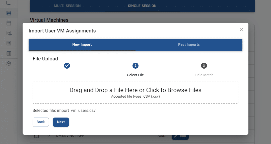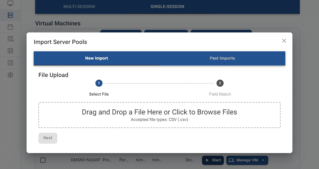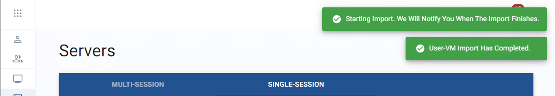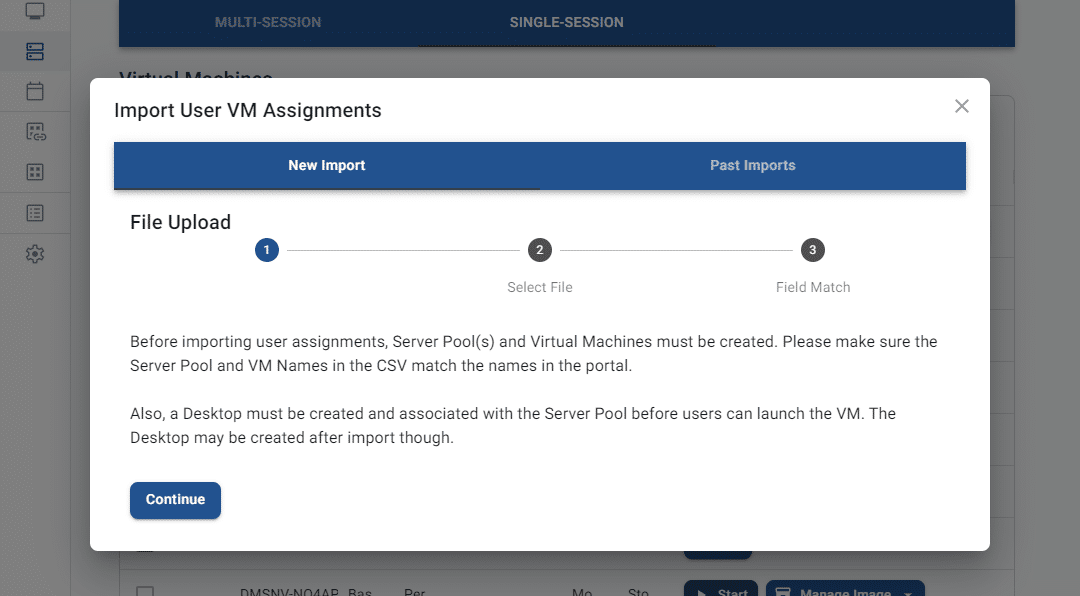 - From the “single-session” tab on the Servers page, click import user VM assignments to trigger the Import user VM mapping pop-up screen.