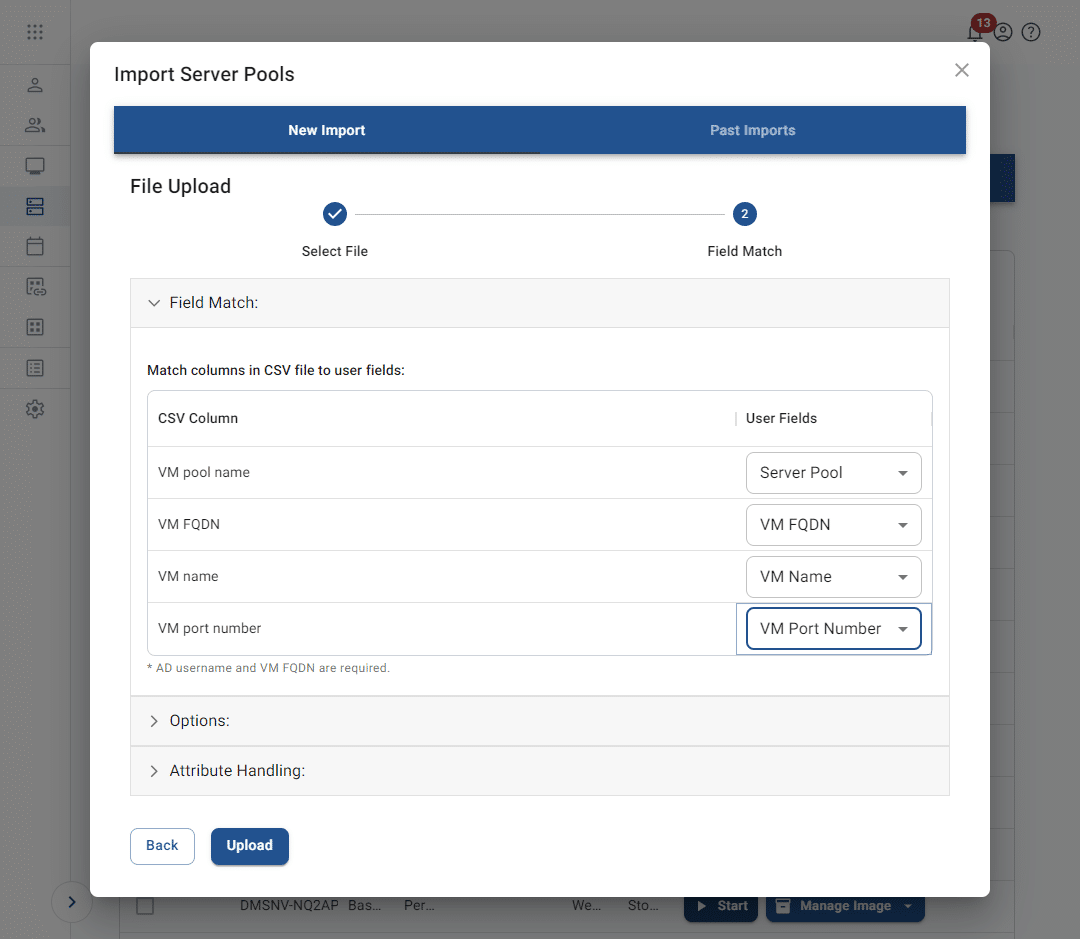 - Prepare a CSV file to map users to servers in the server pool. The CSV can have either named or unnamed column headings, but it should contain at least the following data: “Server Pool Name”, “VM Name”, “VM FQDN”, and “VM Port Number”. During the import process, you will have the opportunity to select which source columns will be matched to these fields.