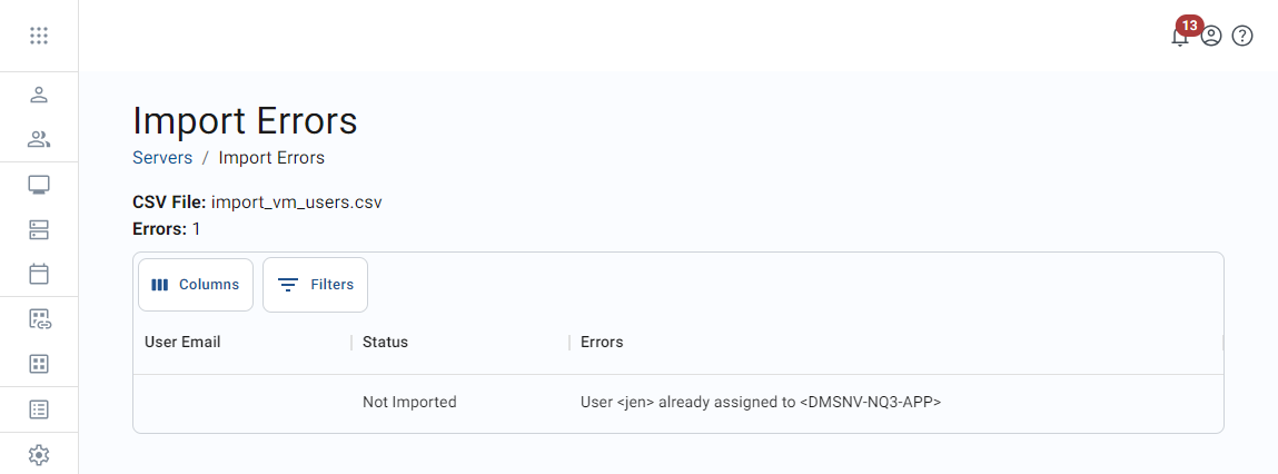 - To view completed imports, click import user server assignments again and select the “past imports” tab of the Import user server mapping pop-up screen. To make it easier to locate specific imports, you may adjust the visible columns or filter or search through the list. See the article on working with lists for more information.