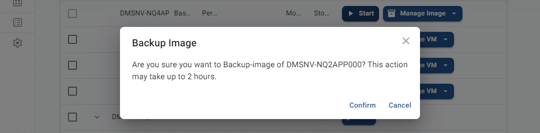 - Click backup image to trigger the Backup image confirmation pop-up.