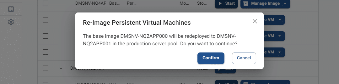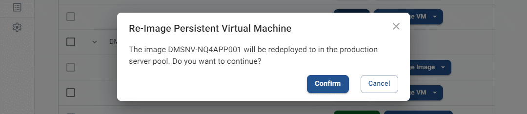 - Click re-image selected servers to trigger the Re-image persistent virtual machines confirmation pop-up.