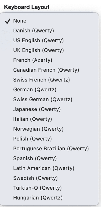 In order for the Apporto cloud desktop to recognize your keyboard language (and unique keys), it is important to set a preferred keyboard layout in your account. Eighteen keyboard languages are currently supported (see list below). If ‘None’ is selected, the system defaults to a U.S. English keyboard.