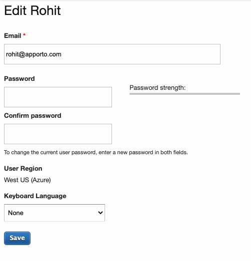 The first time you log in to Apporto (using the one-time login link sent via the Welcome email), you are directed to the Account page to define a password. You can always reset your password via the Account page later. If you get locked out of Apporto (e.g. after three failed login attempts), please contact your administrator or email [email protected] to request a password reset.