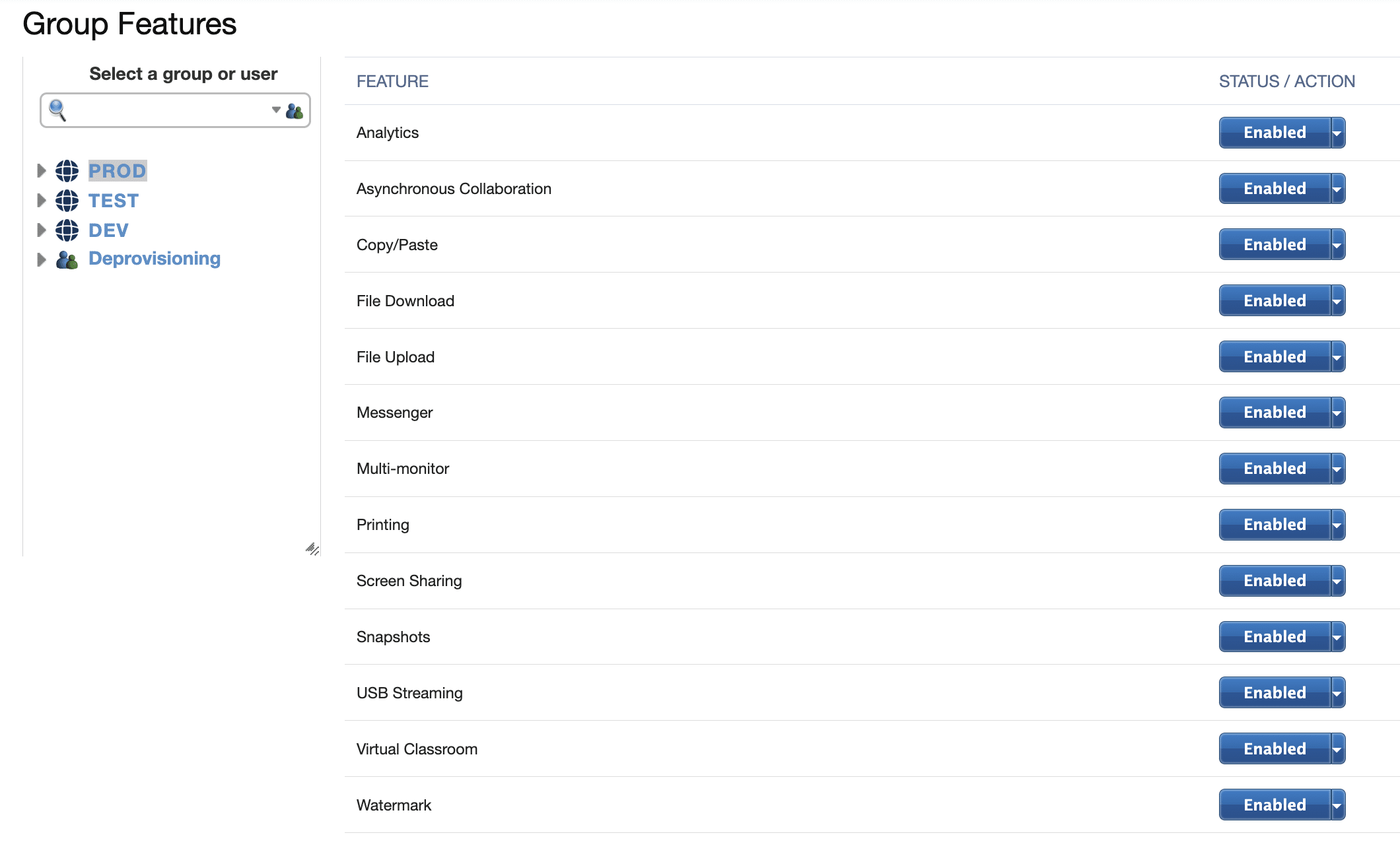 A common use case in education is to disable messenger and screen sharing for particular groups to prevent cheating during exams. If your organization requires a very secure environment (for example, government and medical organizations), you may want to disable file download, copy/paste, printing, and screen sharing.