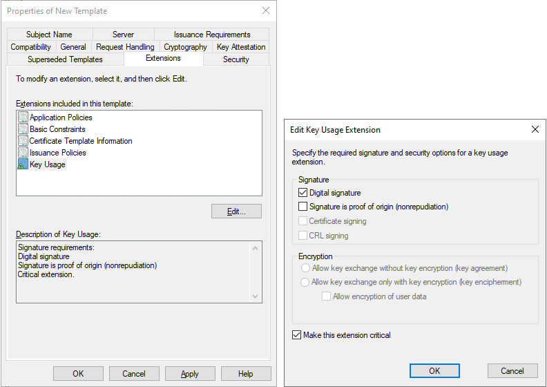 ENABLE_HTTP: falsePORT: 3000ENABLE_HTTPS: trueHTTPS_PORT: port number of the HTTPS service, default 3443 if not setPFX_FILE: path to the domain root certificate in PFX formatPFX_PASSPHRASE: password for the certificateCERTIFICATE_DIR_PATH: the path of temporary directory where the certificates will be generatedCERTIFICATE_THUMBPRINT: the thumbprint of the enrollment agent certificate requested in the previous stepCERTIFICATE_TEMPLATE_NAME: the template name of the certificate created in step 3