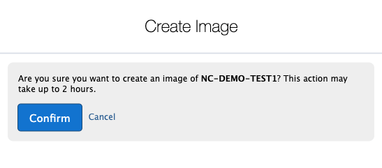 A confirmation dialog displays. Image creation typically takes about 30 minutes (AWS) or up to 2 hours (Azure) depending on the image size. You may not start or launch the TEST server during this time.